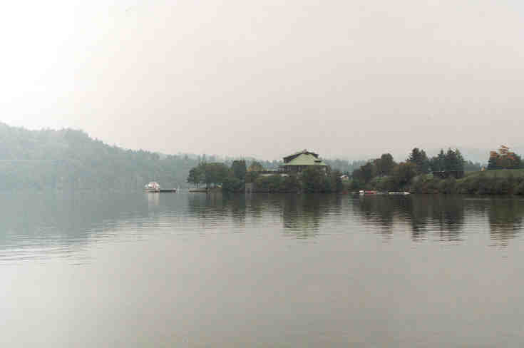 Obozu, opět k pravobřežnímu rekreačnímu centru. Levý břeh je lemován příkrými skalnatými stěnami. Za