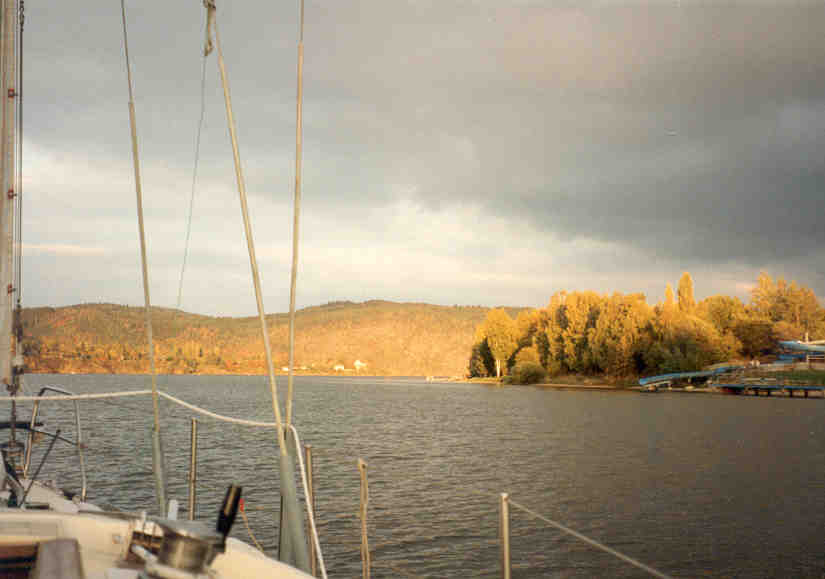strmý masiv. Na pravoboku je další jachtaři obydlená zátoka. Asi 300 m na levoboku jsou těsně za sebou
